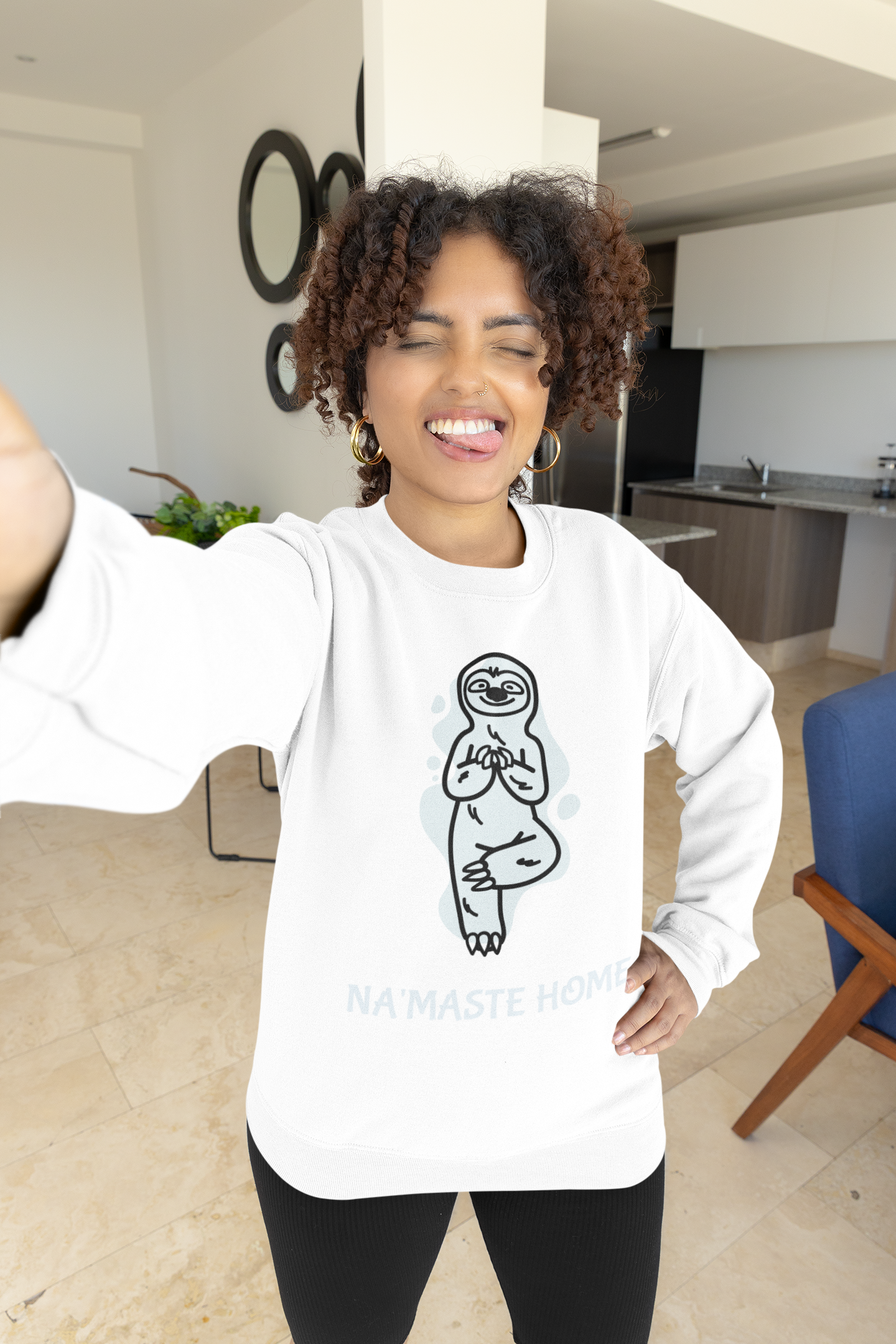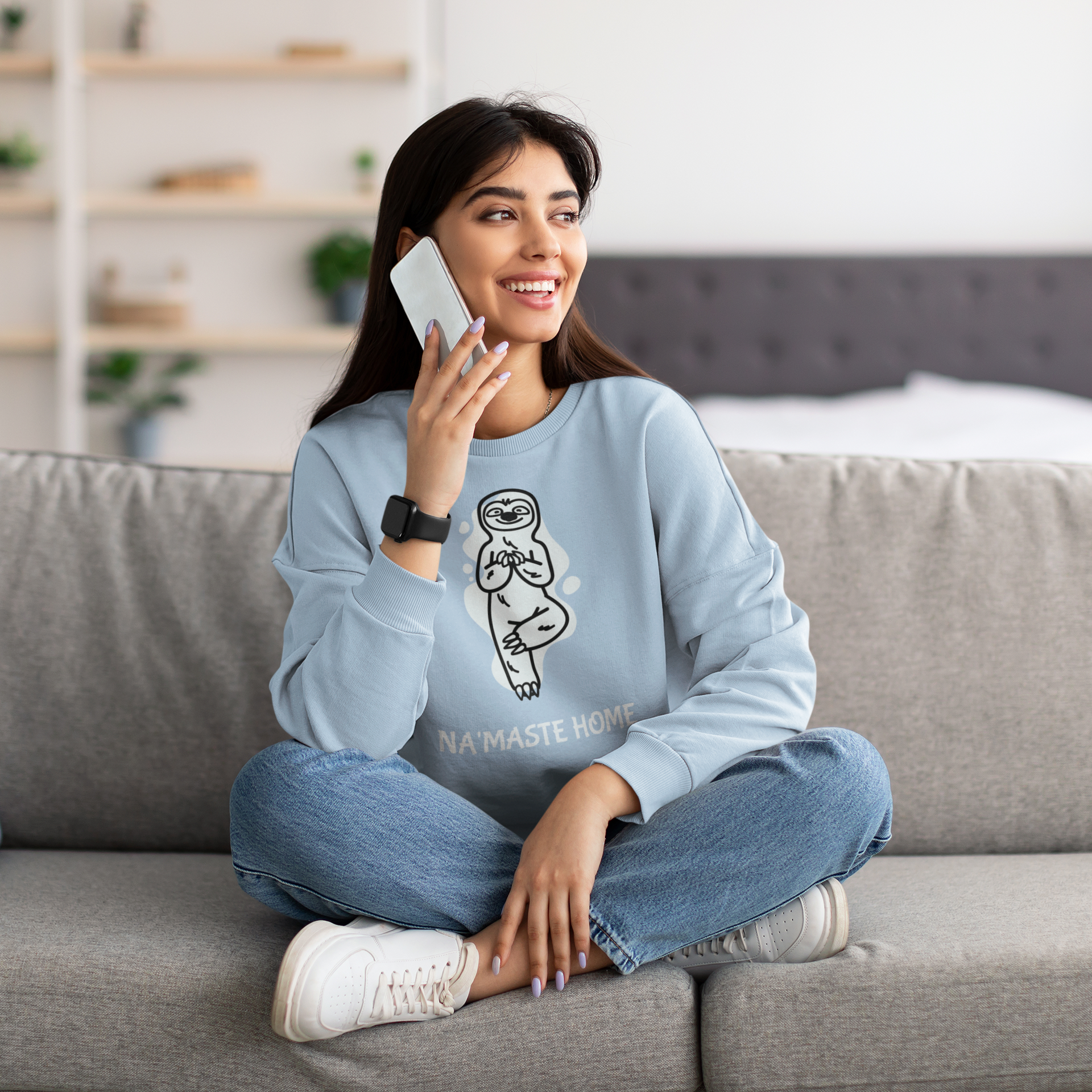 Cozy Crewneck Graphic Sweatshirt - “Namaste Home” Ice Sloth Blue Design by Holy Savage