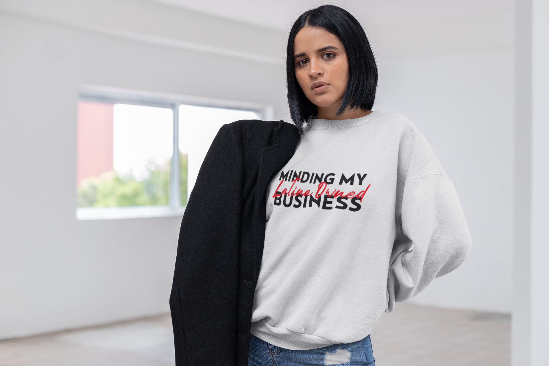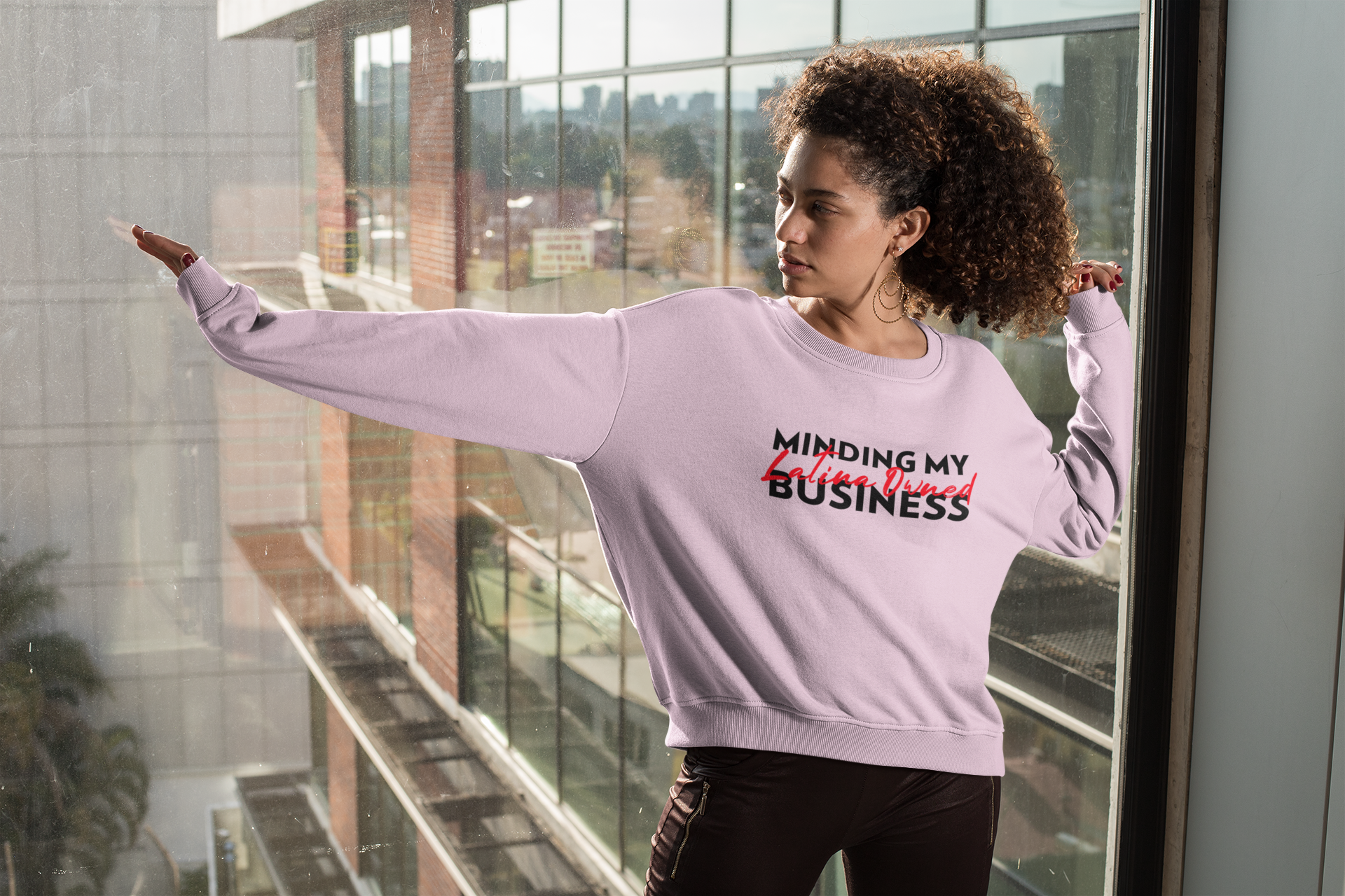 Comfy Crewneck Graphic Sweatshirt “Minding My Latina Owned Business”Red and Black Design by Holy Savage